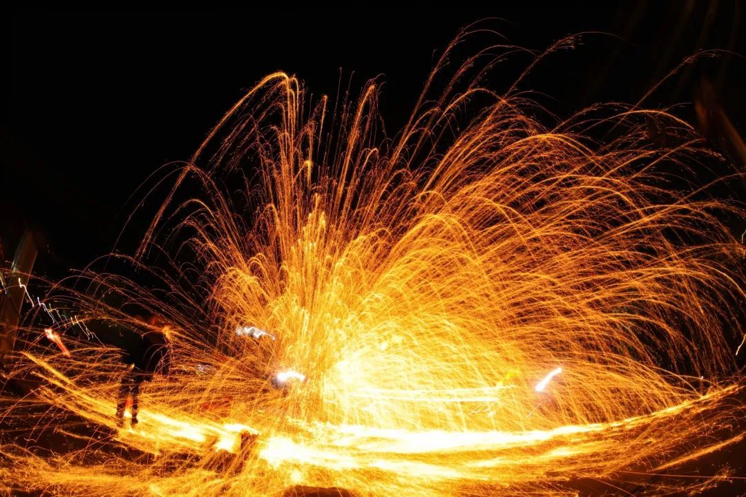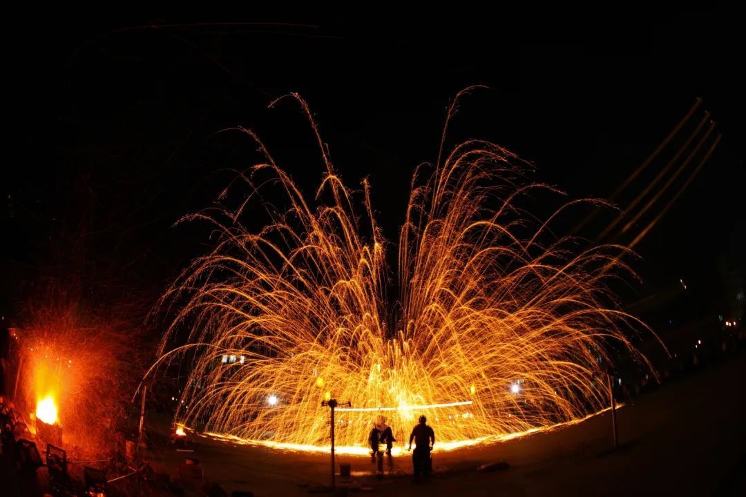 当铁水被奋力扬起,又在下落中被精准击中,拍散的铁花四散迸开,刹那间,如繁星降落般绚烂,绚丽光芒,似银河倾落,金色的铁花雨纷纷扬扬地洒落,在夜空中盛开成一朵朵绝美的花火。