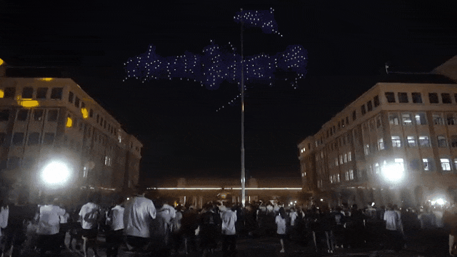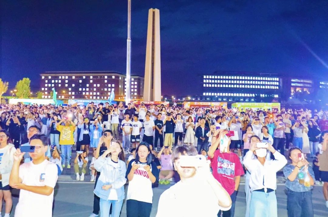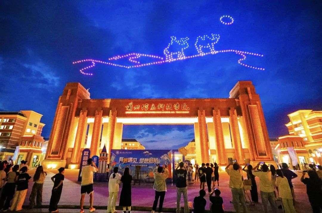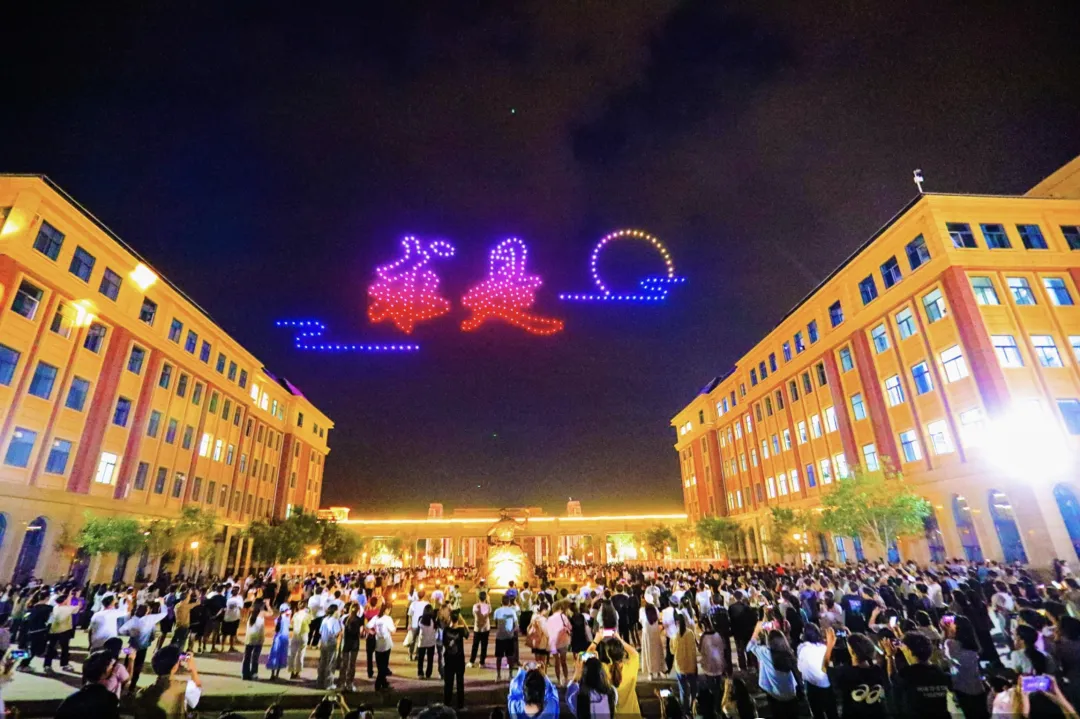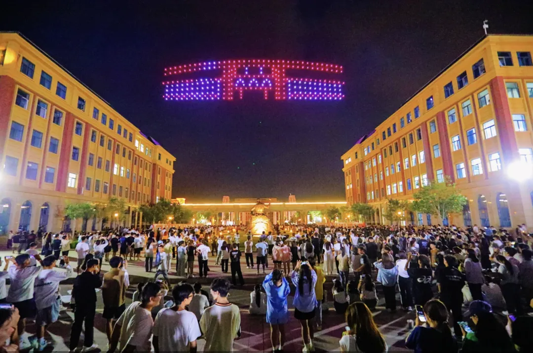 伴随着音乐的节点,300多架无人机腾空而起,犹如繁星点点,“跳”动在校园的上空,演绎着一场“空中舞蹈”,快速变幻的“骆驼沙漠”“梦想塔”,“学校logo”“智慧树教学楼”等图案,给新到的大学生带来了别具一格的精彩体验。