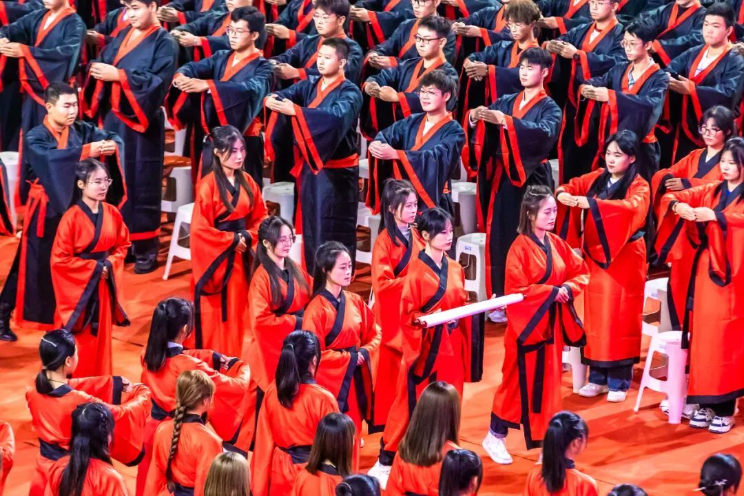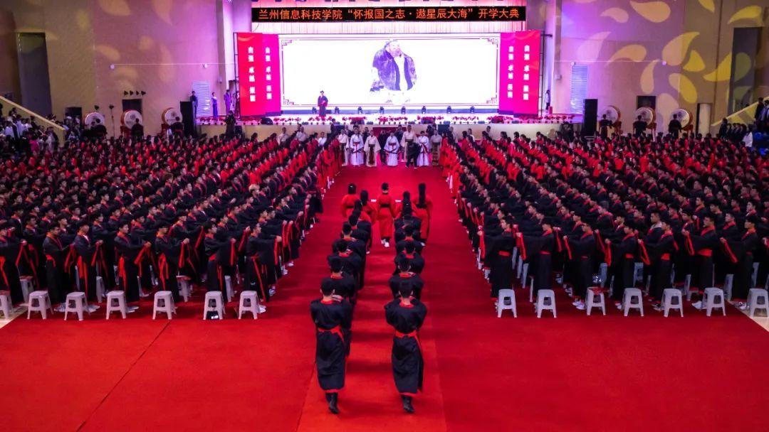 一个原创仪式,氛围拉满,大学之礼,虽诏於天子,无北面,所以尊师也,古有孔圣先师殚精竭虑教化3000弟子,今有兰科俊彦以父母之心抚育莘莘学子,体育馆内身着庄重汉服的老师和新生代表,以原创入学尊师礼拉开开学大典的帷幕。