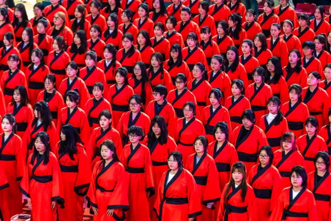 正衣冠、鼓声起、鞠躬俯身行揖礼,在校长程兰华的带领下,全场师生向至圣先师孔子像行三鞠躬礼:鼓初严,拜自强不息;鼓再严,拜厚德载物;鼓三严,拜孝亲尊师。每一次俯身都蕴含着古人尊师重道的优良传统,每一次行礼都蕴含着今人传承文化的坚定决心。