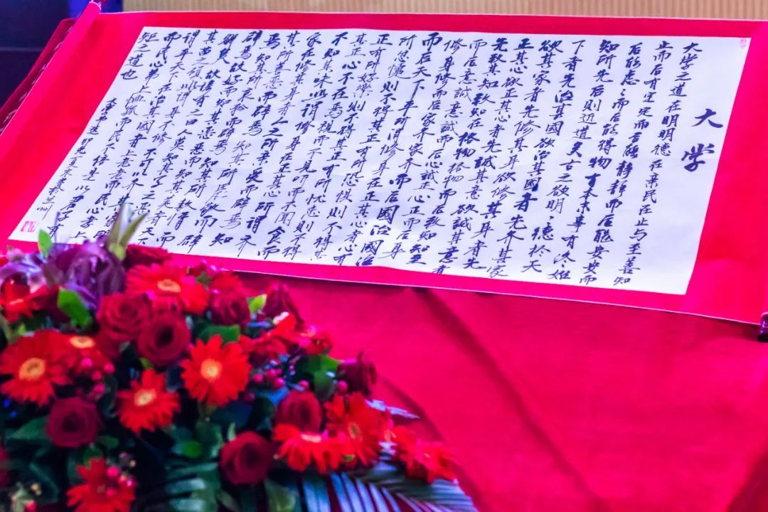 杏坛春晖,泮池桃李;薪火传承,百代不熄;而今吾辈,见贤思齐;卷轴呈案,以示尊师重道。