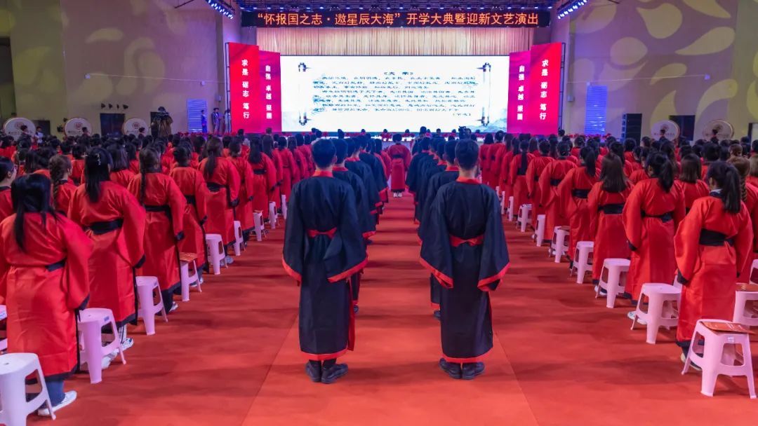 全校师生在体育馆举行了“怀报国之志·遨星辰大海”开学大典,最为震撼的“尊师礼”同学们老师们身着汉服让人眼前一亮。作为一个新时代学子在平时对这样的礼仪仅限于了解,这次有幸能参与其中深深的感受到了古文化带给我们的震撼,由校长带领全体师生诵读《大学》时响亮且浓厚的声音仿佛时光汇聚、不断碰撞,古往今来时代长河在变但作为学子的我们永远对传统文化、礼仪保持着敬意。
