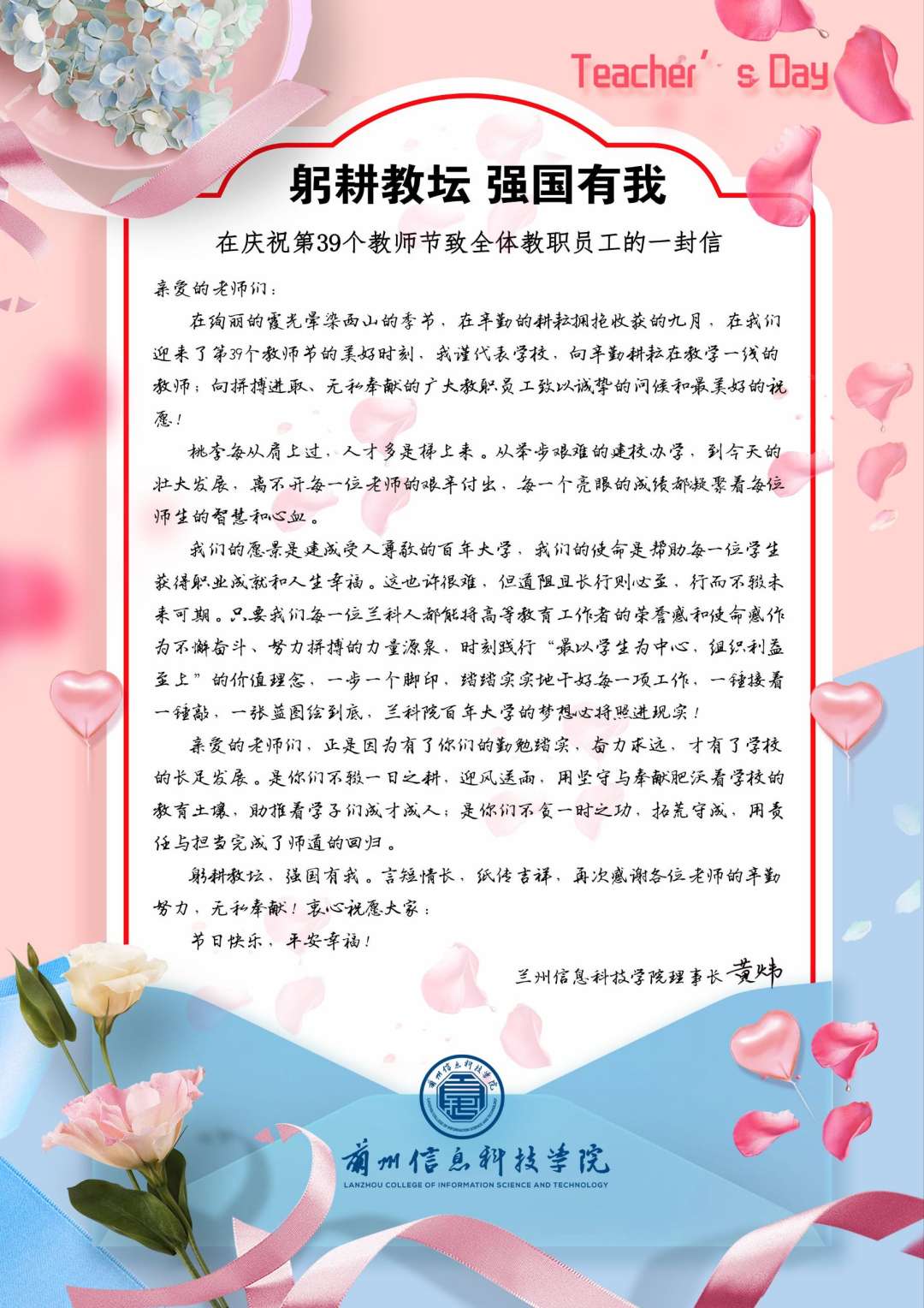 每位教职工都收到了理事长黄炜的一封亲笔信,他感谢每位兰科人的辛勤付出,也向大家致以诚挚的问候。信中如是说: