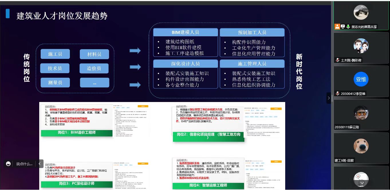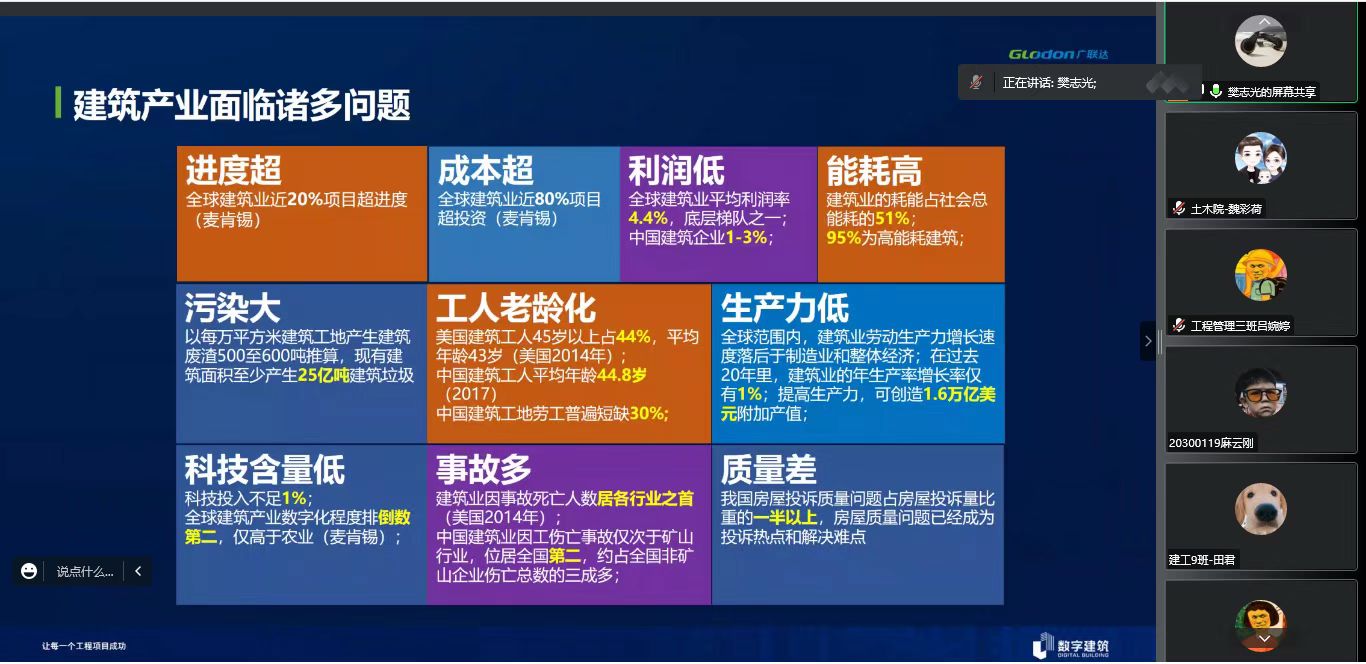 樊志光从数字经济时代新特征、建筑产业发展新要求、智能建造与数字建筑引领新变革3个方面,结合行业发展现状为学生进行了深入浅出而又生动的介绍。讲座中提到,人类社会已步入数字经济新时代,数字化技术呈爆发式增长,建筑产业已进入数字化、信息化变转型升级关键期,而智能建筑就在产业数字化变革中应运而生。智能建造是以BIM、物联网、人工智能、云计算、大数据等技术为基础,主动适应企业需求的高度集成与协同的建造系统。BIM技术为智能建造提供了产品基础信息创造、集成、管理与服务的底层支撑;物联网技术为生产、物流与施工过程中的信息实时获取与传输提供了基础支持;人工智能则为智能建造各环节的智能分析与操作提供了有力保障。我国正处于传统建造向工业化、智能化建造迈进的重要窗口期,智能建造将颠覆建筑业的生产模式,极大提高建筑业的生产力,实现建筑业的转型升级。
