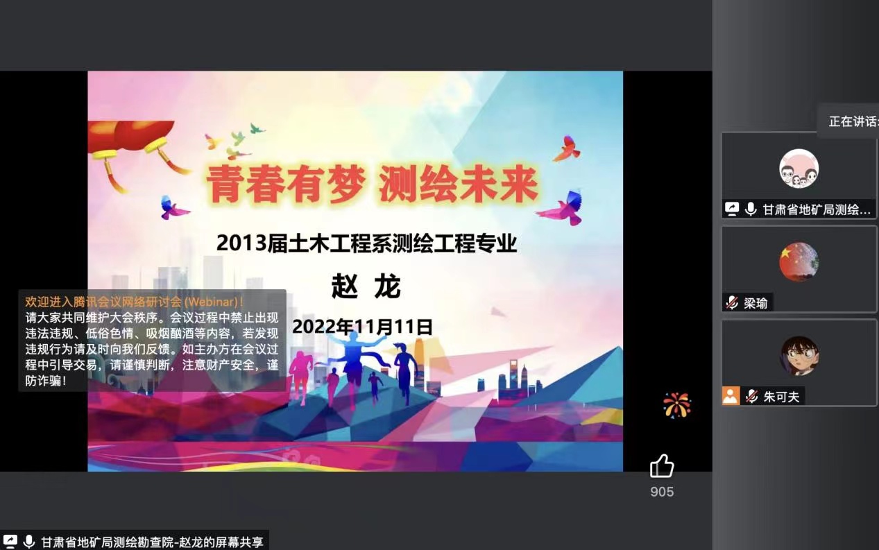 遍交鸿儒友,畅谈青云志。在beat365在线唯一官网迎来20周年校庆之际,土木工程学院邀请2013届测绘工程专业优秀校友赵龙,以线上会议的方式为师生开展专题报告。讲座以“青春有梦,测绘未来”为主题,旨在激励在校学子做好人生规划,为将来高质量就业打下坚实的基础,从朋辈身上汲取更多的宝贵经验。